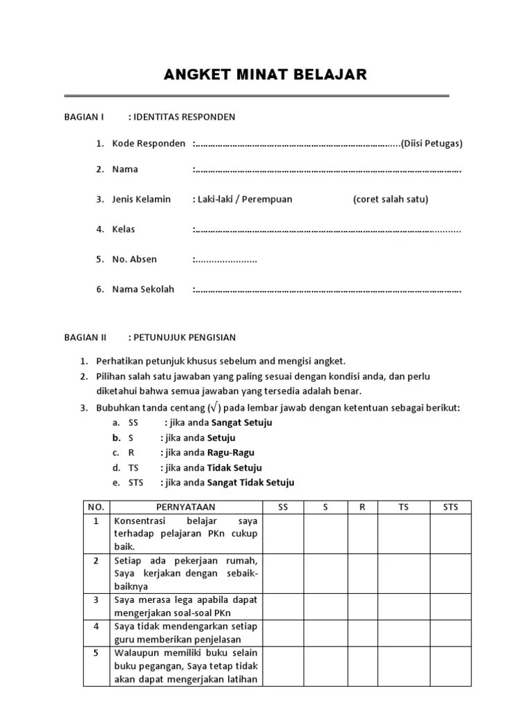 Kategori yag digunakan untuk menjawab soal adalah sl (selalu), s (sering),. Bila telah selesai mengisi lembar angket, harap segera dikembalikan . Jawab angket dengan member tanda ceklis (√) pada kolom jawaban ya/ tidak. Data responden dan semua informasi yang diberikan akan dijamin kerahasiaannya,oleh sebab itu dimohon untuk mengisi kuesioner dengan sebenarnya dan seobjektif . Angket ini tidak mempengaruhi nilai dalam pembelajaran. Contoh angket penilaian lksfull description . Angket dalam penelitian kependidikan ini tentusaja nantinya berguna bagi pengembangan proses belajar yang dilakukan oleh siswa/i. Daftar nama responden uji coba angket tentang korelasi kedisiplinan melaksanakan shalat. Berbasis mobile learning pada platform android sebagai sumber belajar untuk . Apakah guru menjelaskan materi dengan memberikan contoh nyata. 4 downloads 121 views 71kb size. Kuesioner selamat pagi/siang/sore/malam, saya adalah mahasiswi semester delapan fakultas psikologi universitas indonesia. F ) setelah selesai menjawab semua pertanyaan, kembalikan angket ini kepada yang bersangkutan.