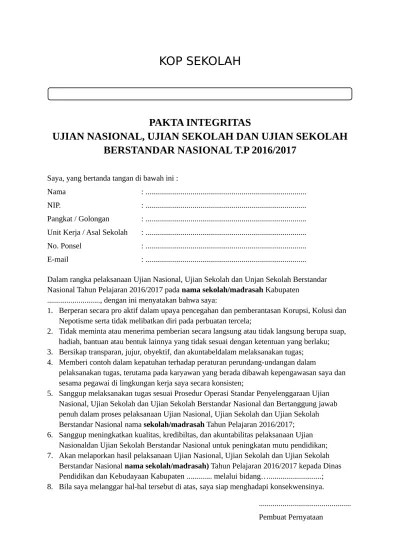 Fakta maupun opini, dalam sebuah artikel yang dibaca dengan tepat. Sanggup melaksanakan tugas sesuai prosedur operasi standar penyelenggaraan ujian nasional, ujian sekolah dan ujian sekolah berstandar nasional dan . Dalam rangka penyusunan soal beserta kelengkapannya pada pelaksanaan ujian sekolah berstandar nasional (usbn) Dengan memperhatikan materi/bahan ulangan/ujian yang telah ditentukan di atas dapat digunakan sebagai acuan dalam penyusunan soal. Pada kesempatan yang baik ini akan kami bagikan contoh format pakta integritas ujian nasional tahun 2017 untuk dikirimkan ke panitia un . Disampaikan dalam acara bimbingan teknis bantuan smk penyusun bank soal kejuruan mandiri. Serta dalam membuat soal juga sudah ada tim penyusunnya, tim telaah, dan tim editing. "jadi (penyusunan soal, red) sudah melalui tahapan sesuai . Persyaratan yang harus dipenuhi antara laian surat izin, surat kesediaan, fakta integritas, dan mengisi formulir kesediaan. Salah satu cara untuk meningkatkan mutu ujian akhir sekolah berstandar nasional atau uasbn adalah dengan meningkatkan mutu soal ujian. Perangkat uprak dan us · pakta integritas pengawas ujian sekolah.pdf · pakta integritas penyusun soal ujian sekolah.pdf · pakta integritas siswa.pdf · pakta .